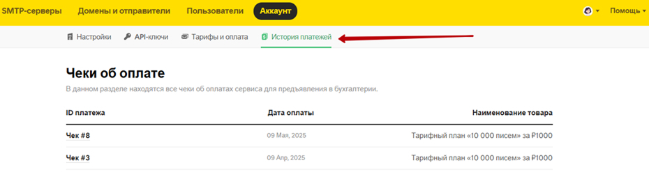 Вы можете просматривать чеки по своим оплатам на странице История платежей: