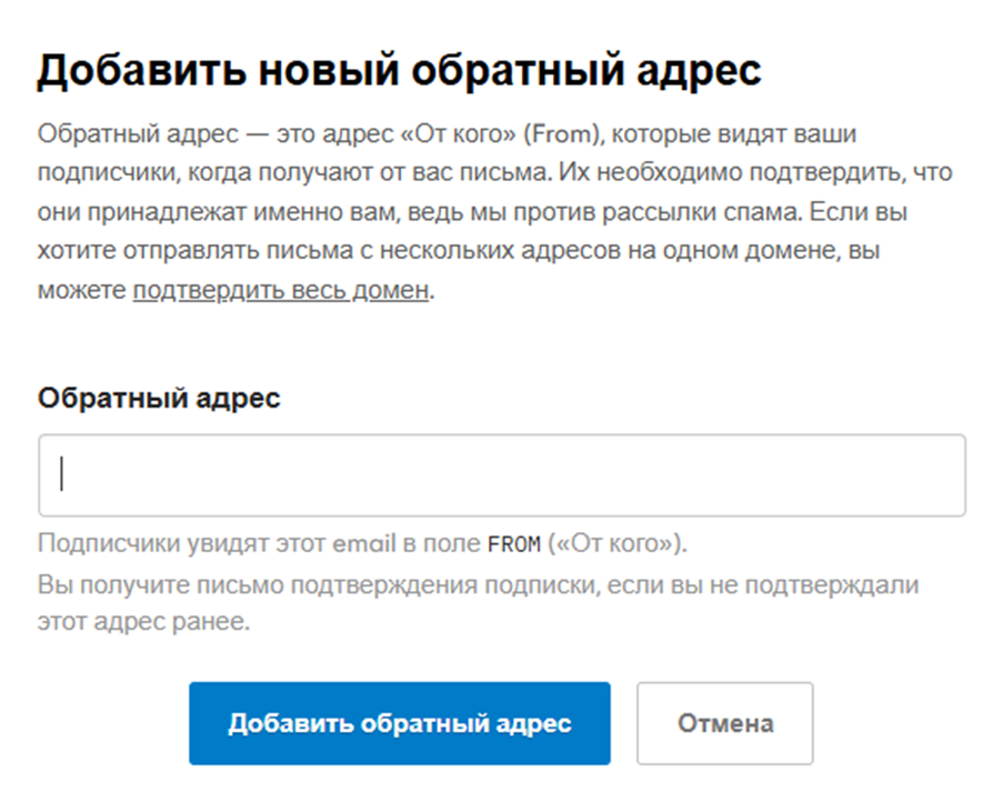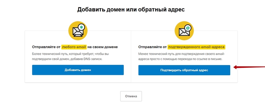 Если вы проходите процесс первоначальной настройки, вам будет предложено создать обратный адрес отправителя сразу после создания аккаунта. После этого вы можете кликнуть на «Подтвердить обратный адрес» и добавить новую почту.