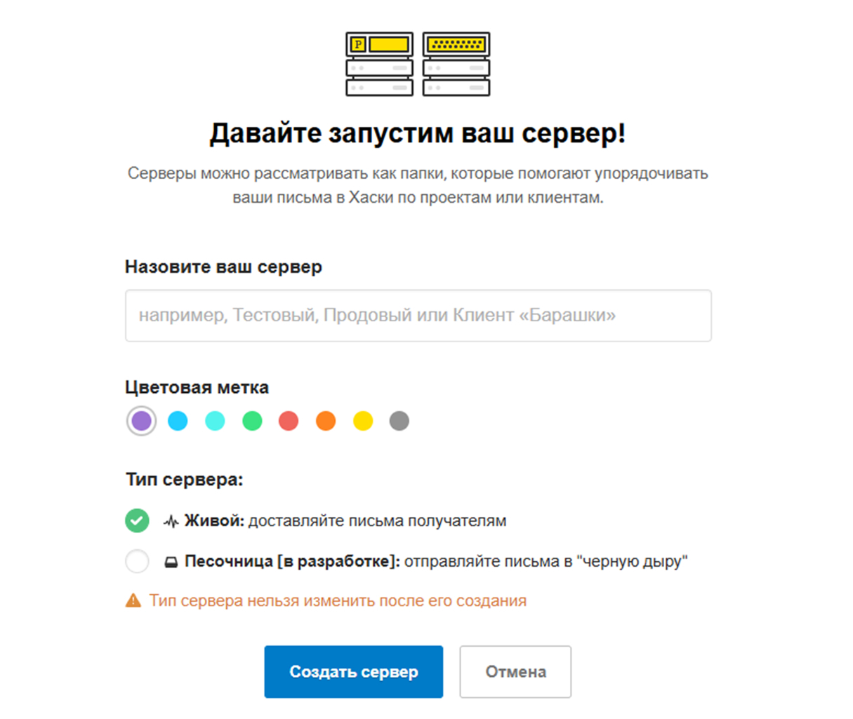 После создания аккаунта мы автоматически создадим ваш первый сервер. Серверы помогают организовывать отправку писем по проектам, клиентам или окружениям, аналогично папкам на вашем компьютере. Каналы отправки помогают разделять различные типы сообщений, которые вы отправляете.