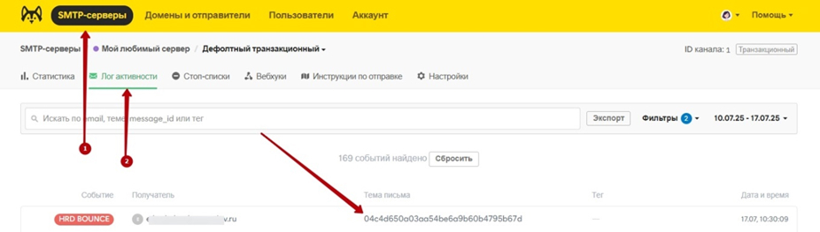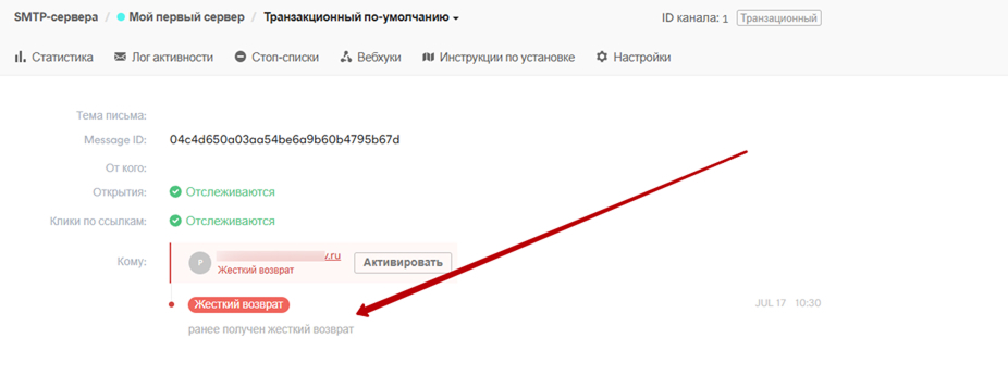 Найти и просмотреть сообщение с жёстким возвратом в разделе «Лог активность» вашего канала отправки.