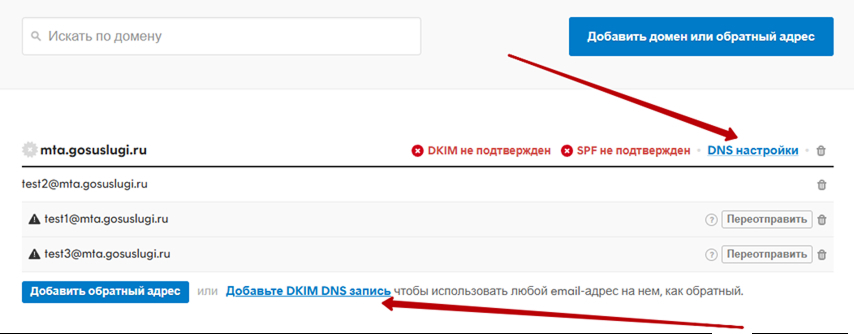 Найдите нужный домен и нажмите DNS Настройки или Добавьте DKIM DNS запись.
