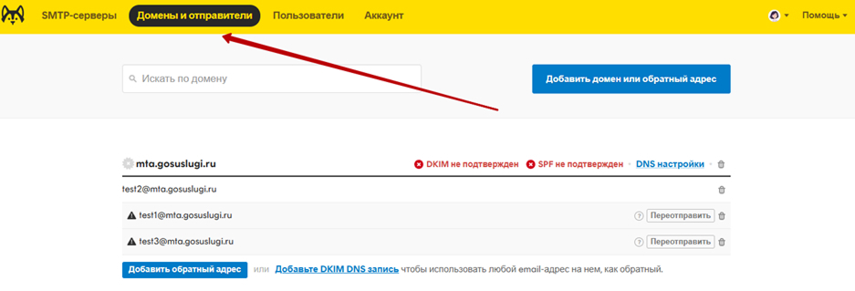 Перейдите на страницу Домены и отправители: