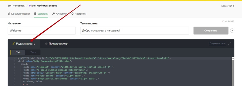 Если вам нужно внести изменения в шаблон, нажмите на вкладку Редактировать в редакторе. Здесь вы сможете редактировать HTML- и текстовые версии вашего письма.