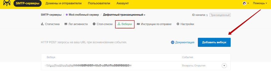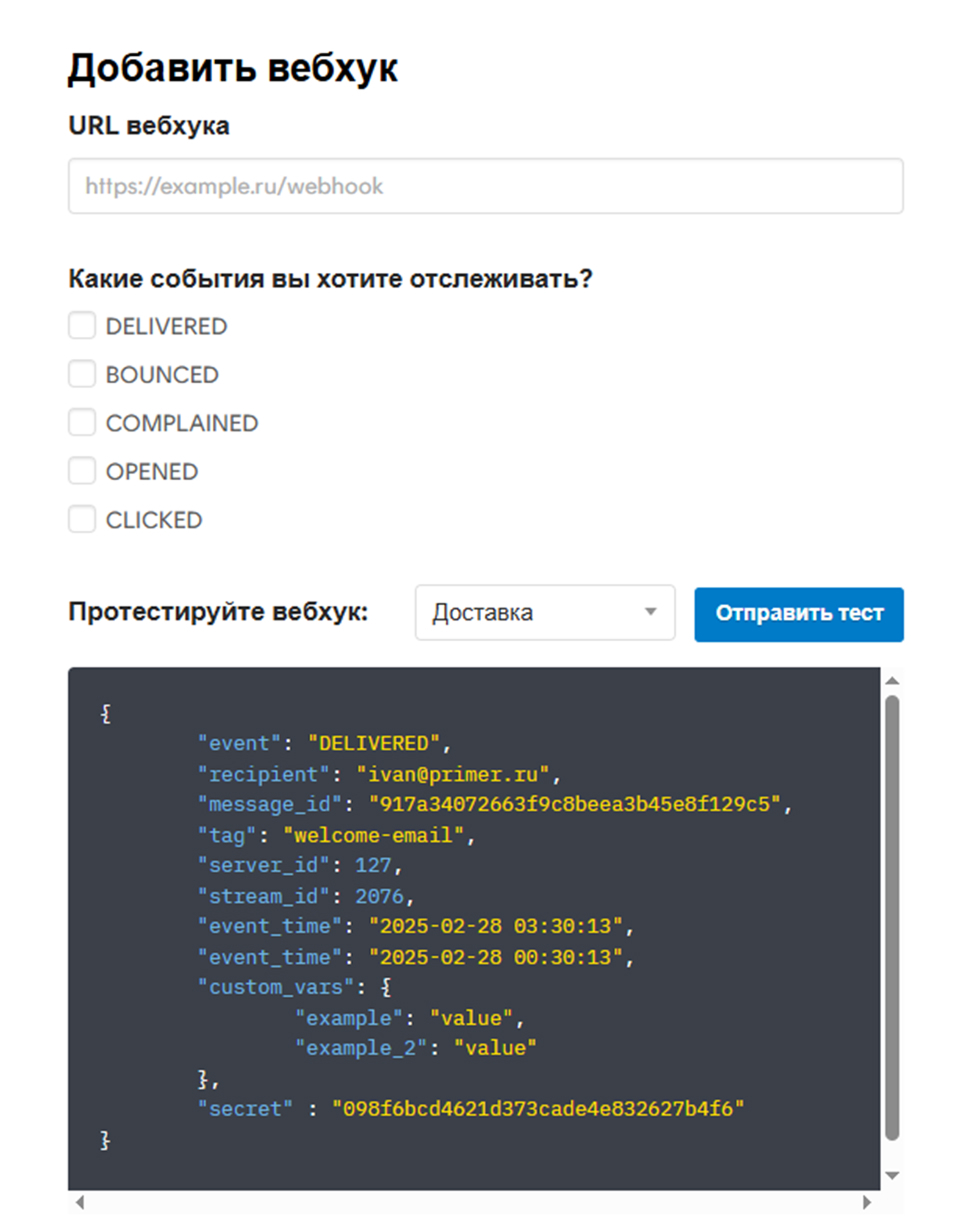 Важно: вебхуки для возвратов и жалоб на спам недоступны для маркетинговых каналов отправки.