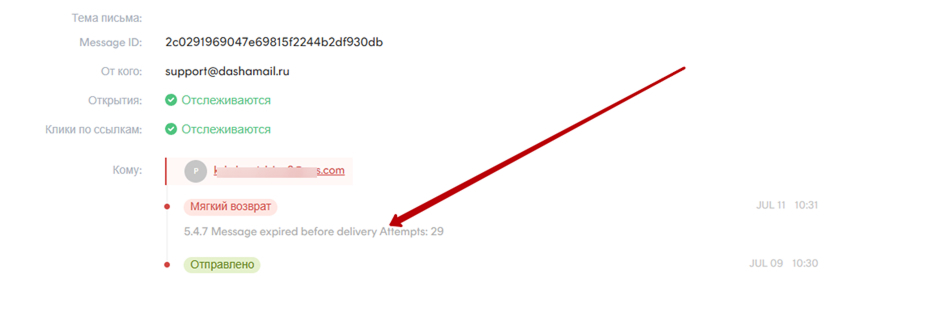 Мягкий возврат означает, что на стороне получателя возникла временная проблема с принятием письма. Мы предпринимаем несколько попыток отправить сообщение в случае ошибки. Когда статус письма показывает мягкий возврат это означает, что мы прекратили попытки отправить это письмо. Причину недоставки можно узнать в информации о письме: