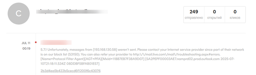 Спам-блокировки необходимо решать на стороне получающего почтового сервера, конкретно с настройками фильтра спама для домена, на который вы отправляете. Свяжитесь с получателем через другой канал и попросите его IT-команду или администраторов почты добавить в белый список ваш домен отправителя или IP-адреса HaskiMail в их настройках спам-фильтра. Вы также можете предоставить им полную информацию о возврате.