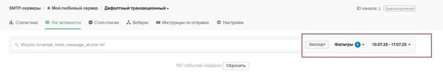 Для просмотра подробной информации о возвратах для каждого письма, перейдите в лог активности вашего канала отправки. В правом верхнем углу вы можете фильтровать по любому типу возврата.