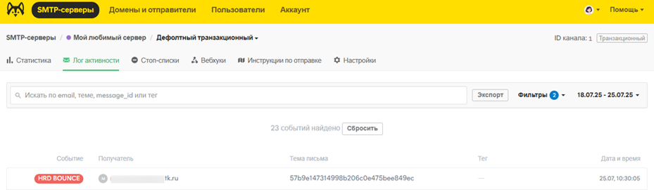 Когда получатель сообщает, что не получил письмо, отправленное через HaskiMail, первым делом стоит проверить вкладку Лог активности в соответствующем Канале отправки. Вы можете ввести адрес получателя в строку поиска, и мы покажем все события для этого получателя, если они произошли в течение периода хранения данных — по умолчанию это 45 дней. Профессиональный совет: используйте фильтры по времени или по теме в поиске, чтобы найти нужное сообщение.