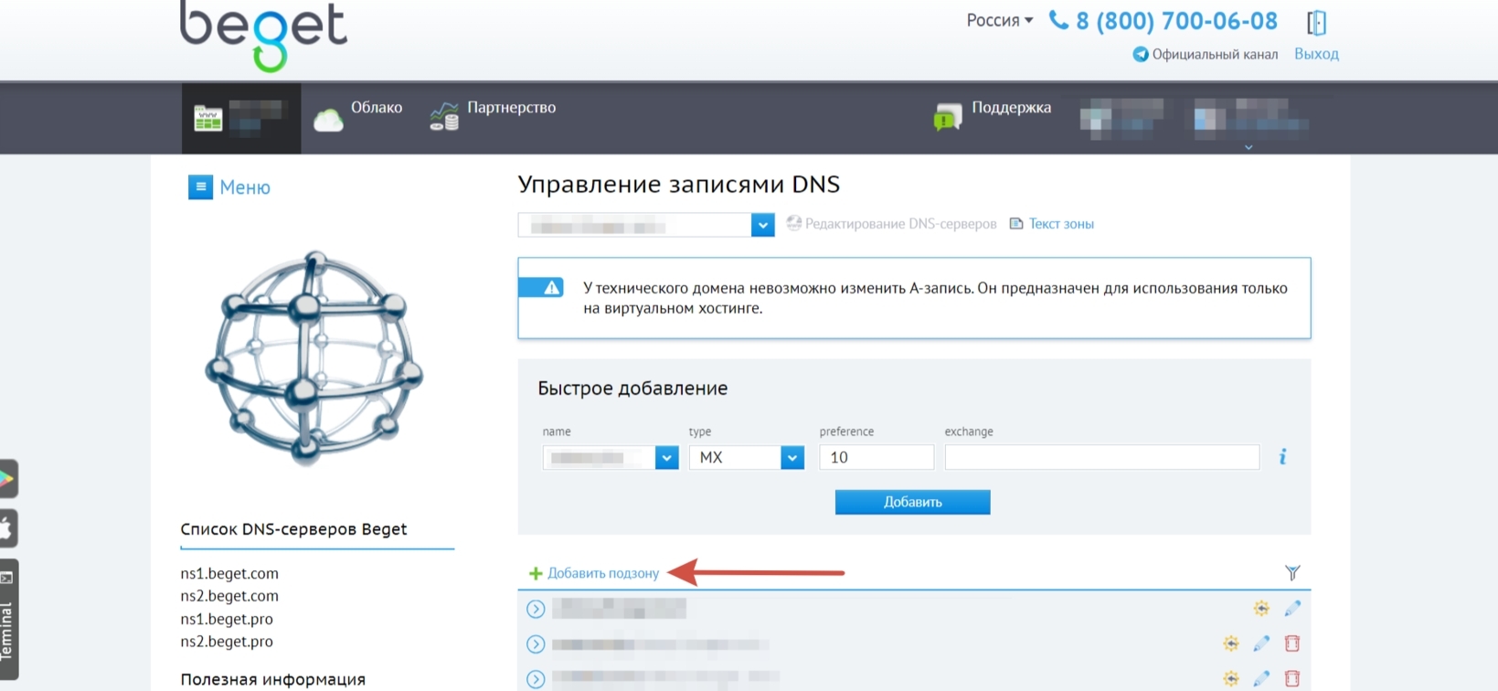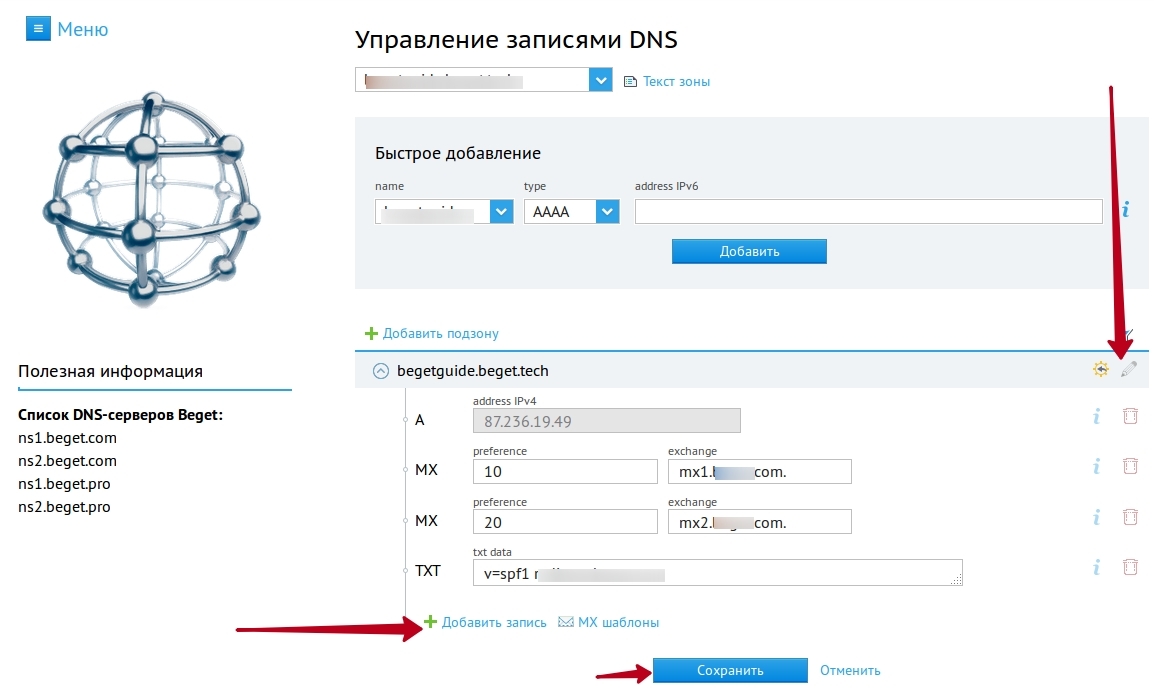 Чтобы настроить SPF в Beget.com, нужно войти в панель управления своим аккаунтом и найти раздел для управления DNS записями вашего домена. Обычно это делается через раздел «DNS-записи» или «Настройка DNS».Найдите в списке ваш домен, нажмите на иконку карандаша, а затем нажмите «Добавить запись»: