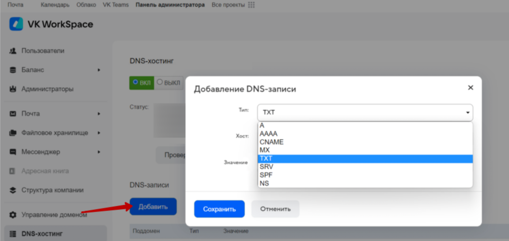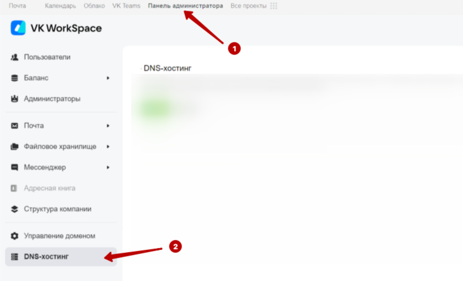 Откройте «Панель администратора» VK WorkSpace и перейдите на вкладку «DNS-хостинг»: