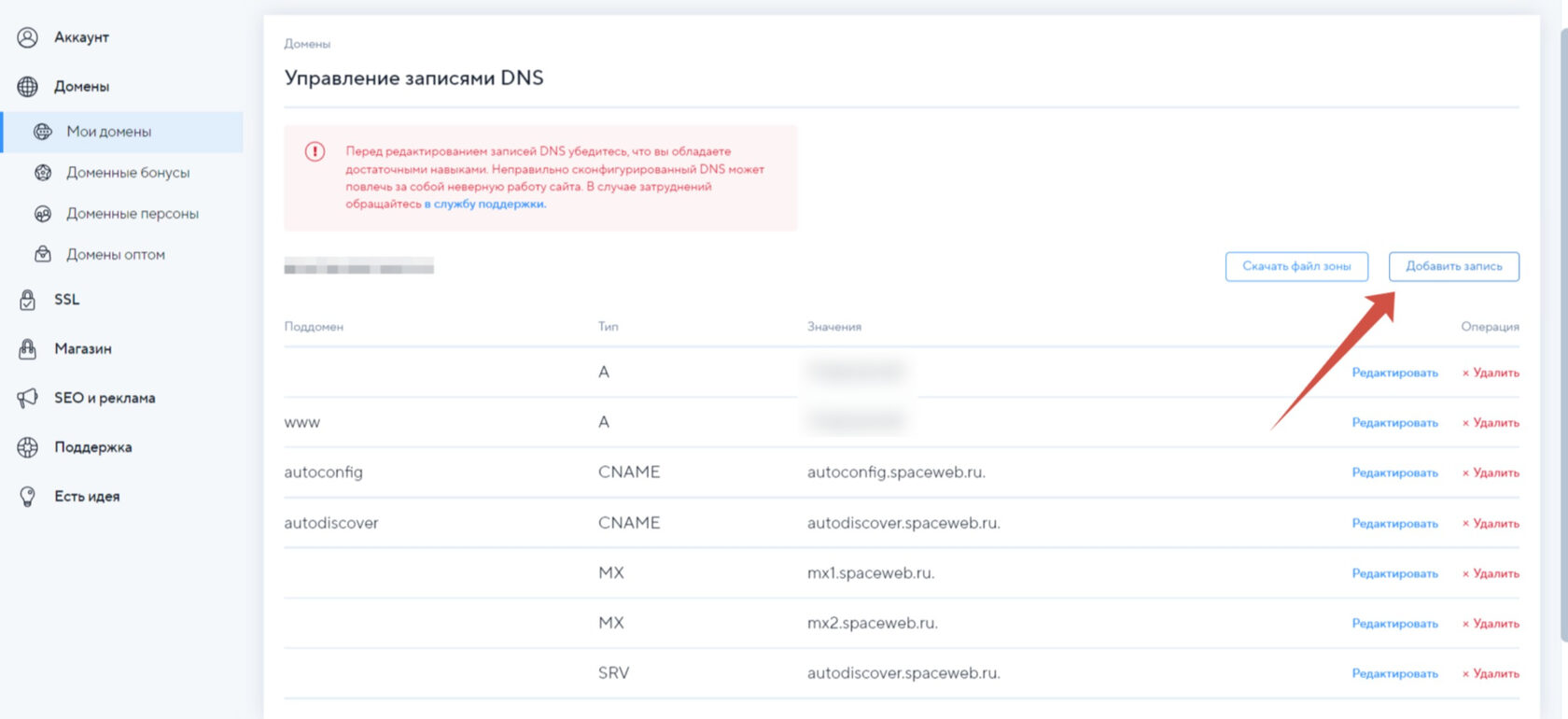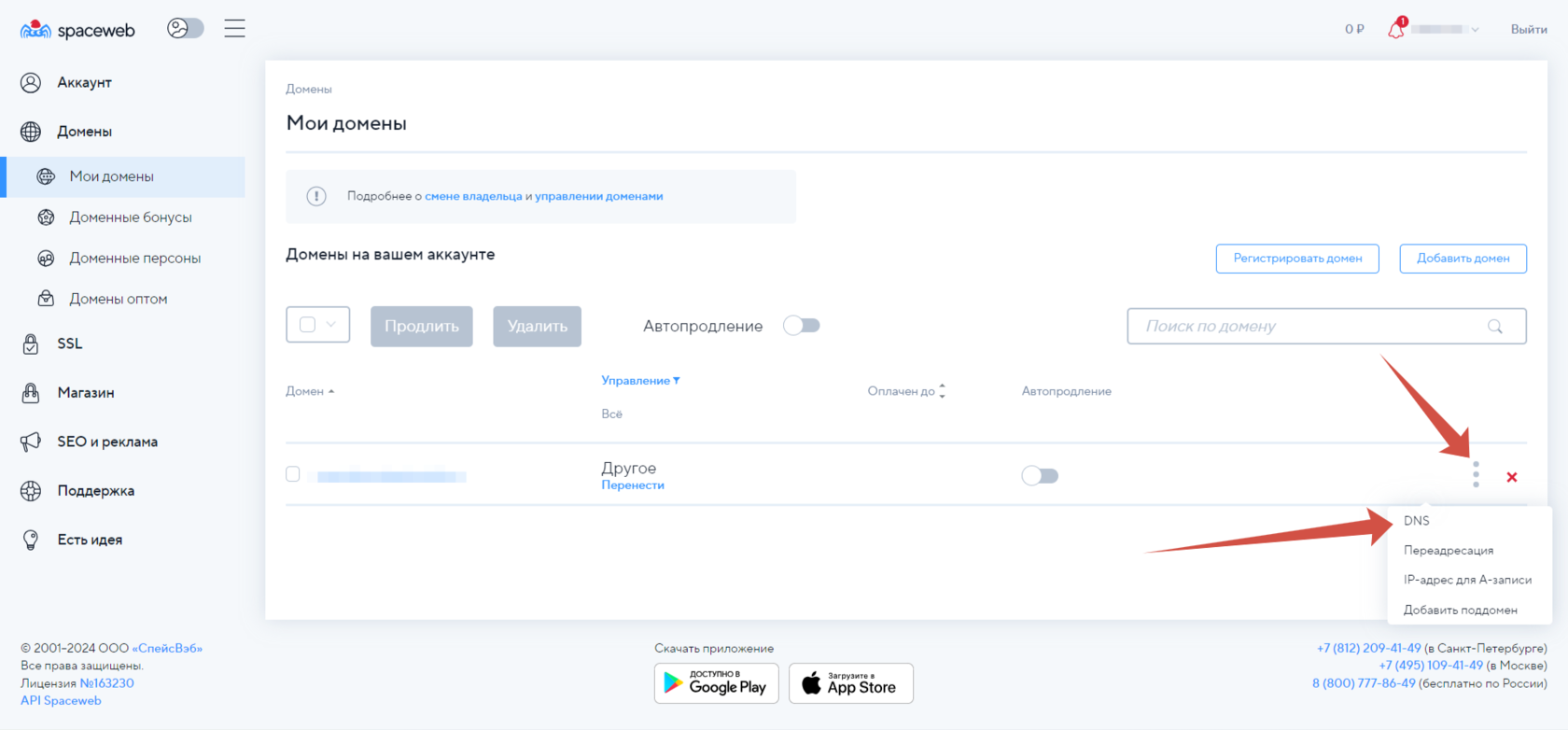 В разделе «Мои домены» нажмите "DNS" в меню, которое находится справа от вашего домена.