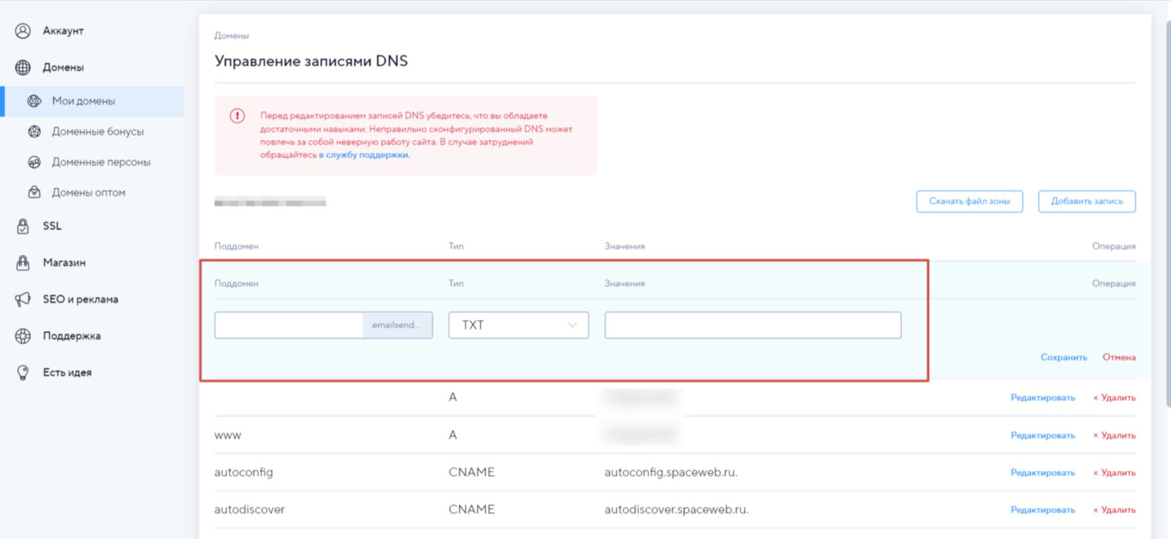 Выберите тип "TXT" и внесите соответствующие записи в полях «Поддомен» и «Значение».